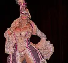 (esquerda) Um homem vestido com um espartilho cônico semelhante ao que Madonna usava durante a Blond Ambition World Tour (à direita). | ||