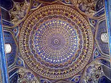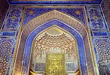 A mesquita tem um grande cúpula ao centro e é ligada a galerias laterais abobadadas por arcadas. A cúpula assenta num tambor cilíndrico alto que se encontra acima de duas camadas octogonais em terraço que são suportadas por um alto pedestal retangular que forma a sala de orações principal. O azul monocromático da cúpula contrasta com a policromia do tambor, que é decorado com faixas de caligrafia. O espaço interior tem um teto plano, no qual é criado um efeito de cúpula por trompe-l'oeil intrincadamente trabalhado, composto de arcos cegos que suportam três camadas de anéis com muqarnas. A sala central é ricamente decorada com relevos dourados (kundal) e ornamentada com incrustações de mosaico vidrado (kashi, por ser originário de Caxã [Kashan]) e estuque inciso. No interior dominam tons azuis e dourados. Os intrincados motivos multicoloridos e dourados do mirabe de mármore são exemplos magníficos do famoso artesanato da região de Mawara'u'n-nahr (nome árabe da Transoxiana).[2]