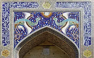 À semelhança do que acontece na Madraça Cher-Dor de Samarcanda, construída entre 1616 e 1636, cujo ivã principal é decorado com leões caçando veados, acima dos quais há sóis com face humana, os tímpanos do ivã da Madraça de Nadir Divambegui são decorados com veados brancos disformes,[4] pássaros mitológicos (provavelmente simurgues, uma criatura alada da mitologia persa, símbolo da benevolência e da fertilidade)[2] que estão voltados para um disco solar com rosto humano de traços mongóis (reminiscente do símbolo zoroastrista de Mitra).[5]