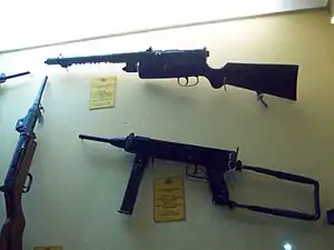 - Hogg, Ian V. (2001). Submachine Guns. [S.l.]: Greenhill Books. pp. 49–50. ISBN 978-1-85367-448-8