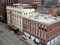 O interior foi originalmente dividido em teatro e espaço de escritórios, com 20.000 pés quadrados (1.900 m2) dos superiores quatro andares usados como a sede da Interstate Amusement Company. O lobby no interior e no auditório era de design barroco com detalhes decorativos que consiste em colunas coríntias, moldagem de ovo-e-dardo, cartelas, e guirlandas romanas e arabescos. O lobby continha um magnífico estilo italiano Vermont chão de mármore preto-e-branco e escadarias de mármore individuais. Outros recursos incluídos um elevador ornamentado gaiola servir as duas varandas, lustres de cristal, espelhos de bronze, samambaias, e uma fonte de mármore.[1] Um posto de concessão foi adicionado ao lobby no final de 1940.