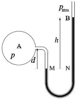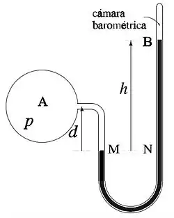 O manômetro mais sensível consiste em um tubo de vidro dobrado em U que contém um líquido apropriado (mercúrio, água, óleo, ...). Um dos ramos do tubo está aberto à atmosfera; o outro está conectado com o depósito que contém o fluido cuja pressão se deseja medir (Figura 1). O fluido do recipiente penetra em parte do tubo em U, fazendo contato com a coluna líquida. Os fluidos alcançam uma configuração de equilíbrio da qual resulta fácil deduzir a pressão manométrica no depósito:
