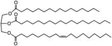 É formada por cerca de 96,6% de triglicéridos (são constituídos por uma molécula de glicerol unida a 3 ácidos gordos ou graxos). Os três principais ácidos graxos encontrados na manteiga de cacau são o ácido palmítico (C16:0), ácido esteárico (C18:0) e o ácido oleico (C18:1).