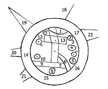 Sete seções triangulares no círculo externo (perímetro de água) representam as ilhas conhecidas, mas o entalhe de argila por estar danificado perdeu as três ilhas na margem inferior.