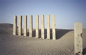 A área aberta tem uma forma semi-retangular, entra-se nesta estrutura através de 8 monólitos com pilares em propileus, encimada por entalhes quadrados projetados para acomodar uma arquitrave. O perímetro da área de peristilo é de aproximadamente 42 m × 19 m e é ladeado pelo final do gabinete de forma oval em suas paredes exteriores a oeste e a leste. O interior da estrutura contém uma grande biblioteca de blocos de pedra inscritos e 64 motivos de janelas falsas verticalmente duplas com 32 pilares feitos de monólito único, exceto dois que sustentavam vigas de pedra. [8]