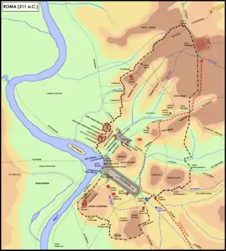Em vermelho, entrando na cidade pelo sul, perto da Porta Capena, as tropas de Quinto Fúlvio Flaco, que depois foram até o norte para enfrentar Aníbal.