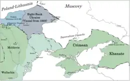 A história da margem direita e esquerda da Ucrânia está intimamente associada à Rebelião Khmelnytski de 1648-1657. O território fazia parte da Comunidade Polaco-Lituana sob a Casa de Vasa até a guerra russo-polonesa desencadeada pelo Tratado de Pereyaslav de Khmelnytski, 1654, com a aliança Moscóvia[1]. Após o conflito de 13 anos, o vitorioso Czarado da Rússia incorporou a margem esquerda da Ucrânia junto com a cidade de Kiev em 1667 após a Trégua de Andrusovo. Enquanto isso, a margem direita da Ucrânia permaneceu na Comunidade Polaco-Lituana até as Partições da Polônia no final do século XVIII. Como parte da Província da Pequena Polônia da Coroa Polonesa, foi dividida em duas voivodias: Kiev e Bracław. Em 1669, Hetman Petro Doroshenko permitiu que a Ucrânia da margem direita fizesse parte do Império Otomano[2]. A Podólia mais meridional na margem direita da Ucrânia foi invadida pelos otomanos em 1672. Após a vitória em 1683 das potências cristãs na Batalha de Viena, em 1699 o Tratado de Karlowitz devolveu essas terras à Comunidade Polaco-Lituana. Durante o século XVIII, duas revoltas cossacas aconteceram. Em 1793, a margem direita da Ucrânia foi anexada pelo Império Russo na Segunda Partição da Polônia[3], tornando-se parte da guberniya ('governorado') da Pequena Rússia.