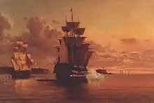 A transferência da sede do Reino de Portugal para o Brasil, em 1808, fez com que também fosse transferida uma parte importante da estrutura, pessoal e navios da Marinha Portuguesa.[27][28] As invasões napoleônicas em Portugal forçaram a Família Real Portuguesa a sair de Portugal e a procurar refúgio no Brasil, de modo a continuar no poder e a manter o Império Português. Esta transferência foi feita por um comboio de 30 navios, que transportaram 15 mil militares e civis.[29][30][31] Com ela, chegou ao Brasil o Ministério dos Negócios da Marinha e Ultramar, e foram criados ou estabelecidos diversos componentes necessários ao funcionamento da marinha. A Academia Real dos Guardas-Marinhas, que também foi transferida, tornou-se o primeiro estabelecimento de ensino superior no Brasil. Por outro lado, o Arsenal Real da Marinha que já existia, viu a sua capacidade ampliada para poder servir à força naval recém-aumentada. Este seria o núcleo da futura Marinha do Brasil.[27][28][32]