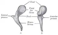 Várias fontes atribuem a descoberta do martelo ao anatomista e filósofo Alessandro Achillini.[3][4] A primeira breve descrição escrita do martelo foi por Berengario da Carpi in his Commentaria super anatomia Mundini (1521).[5] Niccolo Massa's Liber introductorius anatomiae[6] described the malleus in slightly more detail and likened both it and the incus to little hammers terming them malleoli.[7]
