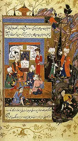 Uma miniatura persa que descreve Jalal ad-Din Muhammad Rumi mostrando amor por seu discípulo Hussam al-Din Chelebi (cerca de 1594).