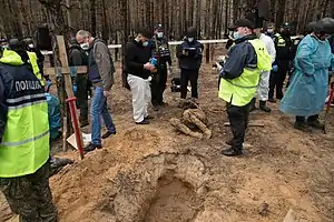 Os corpos foram encontrados em várias valas comuns, incluindo um local contendo pelo menos 445 civis ucranianos,[2] foram encontrados na cidade ucraniana de Izium.[3]