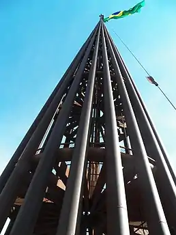 Sua estrutura é em aço corten, com uma parte inferior de 84 metros formada por 24 barras representando os estados e territórios brasileiros na época de sua construção, e a parte superior de 14 metros sustentando a bandeira, uma das maiores hasteadas do mundo e a maior bandeira do Brasil hasteada existente. A troca mensal da bandeira é feita numa cerimônia solene que é uma atração turística da cidade.[1][2]