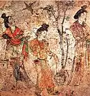 - Figura 2 — "Um grupo de senhoras do palácio nos jardins, enquanto um poupa voa". Mural do túmulo do sexto filho de Gaozong, Li Xian, Qianling, Shaanxi, 706."[36]