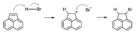 No mecanismo de adição eletrofílica, com a aproximação de uma espécie ou um sítio deficiente em elétrons ao sítio da dupla ou tripla ligação, rico em elétrons, um ataque eletrofílico é realizado, com a doação dos elétrons π para a formação de uma ligação com a espécie eletronicamente deficiente. Com a quebra da ligação π, há a formação de um carbocátion, uma espécie bastante reativa, que reage prontamente com uma espécie doadora de elétrons.