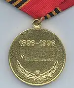 O verso original da medalha, conforme mandado pelo Decreto do Presidente da Federação Russa de 6 de março de 1995 nº 243,[6] tem em seu centro em alto-relevo os anos "1896-1996" e ramos de carvalho e louro na parte inferior seguindo, o circunferência inferior da medalha.