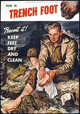 O pé de trincheira é um tipo de dano no pé devido à umidade. Os sintomas iniciais geralmente incluem formigamento ou coceira que pode progredir para dormência.[7] Os pés podem ficar vermelhos ou azulados. À medida que a condição piora, os pés podem começar a inchar e cheirar a podridão. As complicações podem incluir ruptura da pele ou infecção.[7]