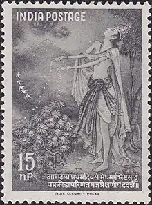 Uma cena de Meghaduta com o yaksha e o mensageiro das nuvens, com o primeiro verso do poema - em um selo indiano (1960)