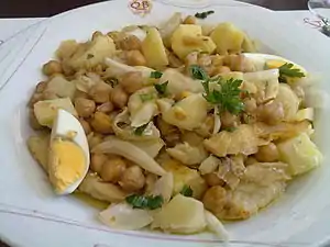 Consiste em bacalhau cozido com grão de bico, podendo ser condimentado com cebolas e alho refogados em azeite, salsa, colorau e vinagre, entre outros temperos possíveis.[1] Pode ou não ser acabado no forno.