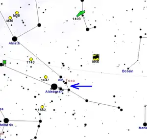 | Ain | Épsilon Tauri | 3,54 | G9.5III | Possui um planeta extrasolar |