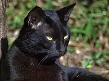 O gato-doméstico (Felis silvestris catus) também possui variantes melânicas da cor da pelagem. Tal variante é geneticamente recessiva e é causada por uma deleção de duas pares de bases no gene Agouti signaling protein (ASIP).[1] Essa mutação é exclusiva de gato doméstico e está totalmente ausente em felinos selvagens, indicando que provavelmente surgiu após o processo de domesticação do gato-da-líbia (Felis silvestris lybica), o ancestral do gato-doméstico.