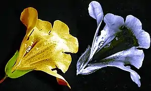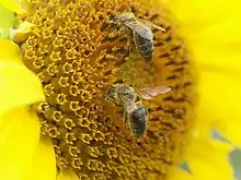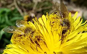 As flores das espécies melitófilas atraem abelhas através de uma combinação de formas, fragrâncias e cores. Assim, as corolas são amareladas (por exemplo, as leguminosas papilionóides , como trevos e alfafa ), esculpidas (ou seja, com as pétalas unidas em dois grupos para formarem dois lábios, como as da "família da hortelã" e alguns compostos ) ou em forma de salgueiro . As corolas têm superfícies para o inseto possuir e guias de néctar (como manchas ou linhas coloridas) que indicam a localização do néctar.[2] Além disso, esses tipos de flores produzem substâncias aromáticas nos osmóforos encontrados na coroa (como Citrus ), na coroa ( Narciso ) ou em outros órgãos florais. As abelhas percebem as cores amarelo, azul e branco. Em vez disso, eles não percebem a cor vermelha pura. Eles também são capazes de perceber os raios ultravioleta, que estão fora do espectro visível para os seres humanos. Por esse motivo, muitas flores amarelas para os nossos olhos, as abelhas as percebem na cor púrpura, que por esse motivo é chamada de "púrpura de abelha".