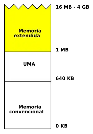A memória estendida está disponível somente em PCs baseados no Intel 80286 ou mais avançados. Somente estes chips podem endereçar mais de 1 MiB de RAM. Os antigos microprocessadores 8086/8088 podiam fazer uso de mais de 1 MiB de RAM através do uso de hardware especial para fazer com que partes selecionadas da memória adicional aparecessem como endereços abaixo de 1 MiB, mas isto não constitui memória estendida segundo a definição deste verbete.
