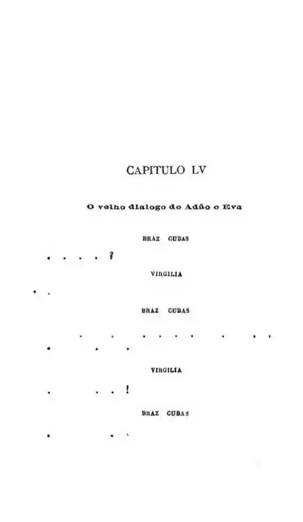 - Este último capítulo é todo de negativas. Não alcancei a celebridade do emplasto, não fui ministro, não fui califa, não conheci o casamento. Verdade é que, ao lado dessas faltas, coube-me a boa fortuna de não comprar o pão com o suor do meu rosto. Mais; não padeci a morte de D. Plácida, nem a semidemência do Quincas Borba. Somadas umas coisas e outras, qualquer pessoa imaginará que não houve míngua nem sobra, e conseguintemente que saí quite com a vida. E imaginará mal; porque ao chegar a este outro lado do mistério, achei-me com um pequeno saldo, que é a derradeira negativa deste capítulo de negativas: — Não tive filhos, não transmiti a nenhuma criatura o legado da nossa miséria.