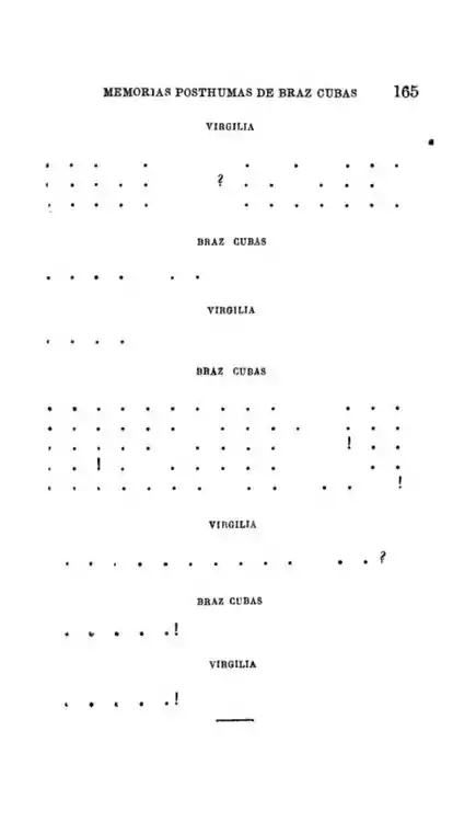 Memórias Póstumas de Brás Cubas antecipa muitos elementos de vanguarda que só serão amplamente assimilados pelo público e explorados pelos artistas no século seguinte ao que foi publicado, conforme atestam autores como Donaldo Schüler[30][31] e José Paulo Paes.[32] Neste aspecto, destacam-se os capítulos LV: O velho diálogo de Adão e Eva e CXXXIX: De como não fui ministro d'Estado, cujos diálogos são pontilhados, recurso tipográfico incomum na ficção da época,[33] mas que, no romance, serve para deixar pensamentos, ações e falas subentendidas, conforme demonstram os trechos abaixo: