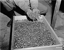 d. As roupas íntimas masculinas e as roupas masculinas, incluindo calçados, devem ser separadas e valorizadas. Depois de cobrir as necessidades dos prisioneiros dos campos de concentração e em exceções para as tropas, eles serão entregues ao Volksdeutsche Mittelstelle. Os lucros vão para o Reich em todos os casos.