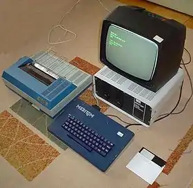 | Armazenamento | fita magnética (500 bauds) ou drive externo de 5" 1/4 |