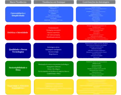 Em seu estudo "Brasil PackTrends 2020" (2012), o Instituto de Tecnologia de Alimentos (ITAL) identificou cinco tendências gerais da indústria de embalagens: 1) conveniência e simplicidade, 2) estética e identidade, 3) qualidade e novas tecnologias, 4) sustentabilidade e ética, e 5) segurança e assuntos regulatórios.[10] Apesar de entregar exemplos do mercado brasileiro, essas cinco tendências não são personalizados para o Brasil, como - para grandes partes - também aplicam à indústria de embalagens em geral.
