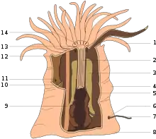 No filo Cnidaria e na classe Anthozoa, os mesentérios são divisórias em forma de lençol que se estendem da parede do corpo do animal até sua cavidade gastrovascular. Eles são compostos por uma camada de mesogleia imprensada entre duas camadas de gastroderme. Elas podem ser "completas", unindo a gastroderme da parede do corpo com a da faringe, ou "incompletas", estendendo-se apenas parcialmente para dentro da cavidade (os termos "perfeitas" e "imperfeitas" são às vezes usados em seu lugar). Eles se estendem do disco pedal até o disco oral, e há duas perfurações ou óstios próximos ao disco oral. Os mesentérios geralmente estão em pares. A borda livre dos mesentérios incompletos é espessada para formar faixas glandulares e ciliadas denominadas filamentos mesenteriais. As extremidades inferiores dos filamentos mesenteriais são alongadas em acontia armadas com cnidoblastos (células urticantes) e podem se projetar através da parede do corpo ou da boca. As gônadas estão situadas nos mesentérios ao lado dos filamentos mesenteriais.[5]