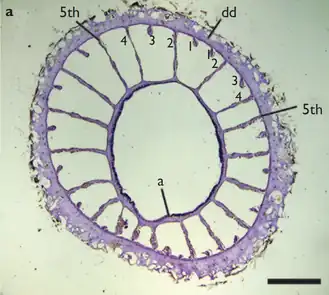 Os corais moles, da ordem Alcyonacea, têm oito mesentérios primários que se alternam com os oito tentáculos.[5] Os mesentérios são completos e não pareados, com filamentos unilobados.[4]