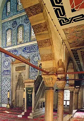 O interior da mesquita é famoso pela profusão de requintados azulejos de İznik, com grande variedade de motivos florais em tons de azul e verde e painéis de caligrafia com letras brancas sobre fundo azul. As colunas interiores são de mármore policromado. O mimbar é de mármore branco com um topo cónico coberto de azulejos de cor turquesa, do mesmo tipo que é usado para emoldurar mirabe. As janelas por cima do mirabe são de vitrais. Por cima da porta está um fragmento da Caaba, de Meca, emoldurado por ornamentos dourados. O mirabe e o mimbar também contêm fragmentos da Caaba.[2]