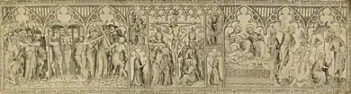 O Parement of Narbonne é feito em tinta preta sobre seda, com efeito grisaille. Inclui cenas da Paixão de Cristo bem como de sua Ressurreição. O então rei Carlos V de França e sua rainha, Joana de Bourbon são mostrados de joelhos dos dois lados da cena de Crucificação no centro. Isso sugere que a obra foi encomendada entre 1364 (data de sua ascensão ao trono) e 1378 (morte da rainha).[2] É também possível que tenha sido encomendado para uso no período da Quaresma, quando os altares são cobertos por panos.