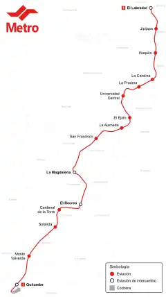A primeira linha do sistema, que inclui 15 estações, vai de Quitumbe (que fica ao sul da cidade) até El Labrador (ao norte da cidade). As 15 estações desta linha são, de norte a sul:[9]