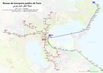 O sistema possui 32 km de comprimento, cerca de 47 estações, divididas em 7 linhas cortando a cidade de Tunis, na Tunísia.