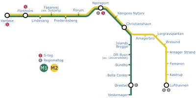O plano final, proposto em 1996, consistia em duas linhas que seguiriam o mesmo trilho desde o distrito de Vanløse, atravessaria o centro até ao final da ilha de Amager. Aí separar-se-ia para Oeste (M1) e para Este (M2). As linhas foram inauguradas em 2002 e foram alongadas para o traçado actual em 2003.