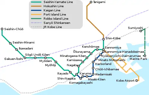 | Linha Kaigan | Vermelho | Shin-Nagata ↔ Sannomiya-Hanadokeimae | 2001 | 10 |