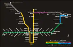 - Yonge-University Linha 1, aberta em 1954, a linha de metrô tem a forma de U, vai de norte a sul da cidade, ao longo principalmente da Yonge Street, University Avenue e Allen Road. Estações terminais Vaughan Metropolitan Centre - Finch, 39,6 km, 38 estações.[1]