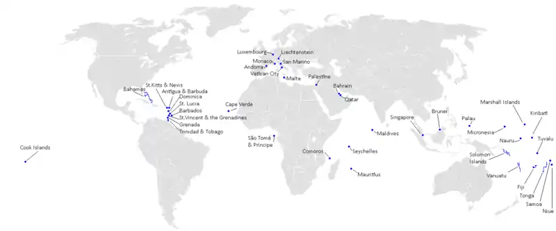 Os estados soberanos estão localizados nas seguintes regiões do globo: sete na Oceania, sete na América Central, seis na Europa Ocidental, duas no oceano Índico, além do Barém no Oriente Médio, e Singapura no Sudeste Asiático. Os seis microestados da Europa são: Malta, Andorra, Listenstaine, São Marinho, Mônaco e Vaticano. Com exceção do Barém, todos esses países têm sua economia baseada no turismo, com um pequeno apoio da agricultura e pesca. Também oferecem à sua população um elevado Índice de Desenvolvimento Humano (IDH), de 7 a 9 pontos (em uma escala adaptada de 0 a 1, para 0 a 10).