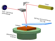 Para tal fim, utilizamos o microscópio de força atômica, desenvolvido em 1985 pelo Dr. Gerd Binnig e outros investigadores. Ao desenvolver o aparelho, Binnig visava medir forças menores que 1μN entre a ponteira (tip) e a superfície da amostra.[1]