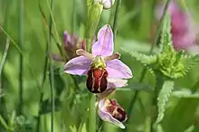 O mimetismo sexual interespecífico também pode ocorrer em algumas espécies de plantas. O exemplo mais comum é conhecido como polinização sexualmente deceptiva e é encontrada entre algumas orquídeas.[28] A orquídea imita seus polinizadores do sexo feminino, geralmente himenópteros como vespas e abelhas, para atrair os machos para a flor. Flores de orquídea imitam o sexo feromônios e, em algum grau, a aparência visual do inseto fêmeo de seus polinizadores de espécies. O primado da olfativa através de sinais visuais tem sido demonstrada em muitos casos, como no gênero europeu de orquídeas Ophrys, assim como muitos australianas sexualmente enganosas. Em alguns outros casos, como a margarida sul-africana Gorteria diffusa, os sinais visuais parecem ser de importância primordial.[29] Sinais visuais também aumentar a atratividade das flores de algumas Ophrys espécies a seus polinizadores.[30][31] Algumas vespas machas escólidas, tais como Campsoscolia ciliata são mais atraídos para a Ophrys flores odores do que os odores das vespas do sexo feminino, embora ambos atrair os machos com os mesmos compostos. Este é, provavelmente, resultado de uma maior quantidade de cheiro vindo da flor orquídea; vespas do sexo feminino tendem a produzir menos perfume para evitar atrair predadores.[32] Independentemente de orquídeas usarem aparências, fragrâncias ou ambos, eles imitam a fêmea de polinizadores para seu próprio benefício.