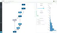 O terceiro tipo de Mineração de Processos é chamado de aprimoramento ou extensão e visa melhorar e enriquecer um modelo existente de processo a partir de informações do processo que podem ser extraídas do log de eventos. Um exemplo de aprimoramento é a combinação de modelos de processos com dados de desempenho, obtidas por exemplo na data de início e término das atividades. A Figura 8 ilustra a aplicação da extensão em um modelo de processo, onde é possível observar algumas atividades e transições com uma maior ênfase. Nesse caso em especifico, as atividades nas cores acentuadas para o vermelho representam tempo de execução maior em relação as outras atividades, caracterizando possíveis gargalos no processo.