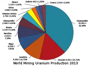A mineração de urânio retira minério de urânio do solo para processamento. Cazaquistão, Canadá e Austrália são os três maiores produtores e juntos respondem por 64% da produção mundial de urânio. O urânio da mineração é usado principalmente como combustível para usinas nucleares . Estudos de saúde e ambientais mostram que a exposição à radiação representa um risco para os mineradores de urânio. Em 1990, o Congresso aprovou uma legislação para ajudar as pessoas afetadas pela mineração. Em julho de 2014, o preço do concentrado de urânio permaneceu perto de uma baixa de cinco anos, o preço do urânio caiu mais de 50% em relação ao preço de pico em janeiro de 2011 e refletiu a perda de demanda após o desastre nuclear de Fukushima em 2011. Alguns planos para novas minas e expansão de minas foram adiados.