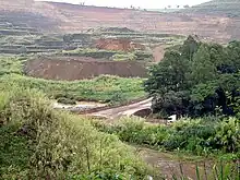 A mineração a céu aberto, o modelo mais comum no Brasil, provoca grandes transformações na paisagem pela remoção da terra, demolindo morros inteiros e abrindo vastas crateras, pois a concentração dos minérios no solo tipicamente é baixa e por isso é necessário a remoção de imensas quantidades de solo para obter quantidades economicamente viáveis de minerais.[8] A alteração da área minerada também desencadeia significativo desmatamento e perda de biodiversidade.[6][8] Por mais bem realizada tecnicamente que seja esse tipo de exploração, os danos são inevitáveis devido à desfiguração em larga escala da paisagem.[8][55] Em diversos casos isso impactou áreas urbanas próximas, obrigando à remoção de vilas inteiras, como ocorreu em Congonhas e Itabira.[8] Não apenas a mina em si é o problema, pois a operação envolve a construção de outras infraestruturas de apoio, como estradas de acesso e vilas para os trabalhadores.[52]
