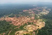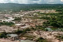 De 2017 a 2020 o desmatamento fruto de mineração ilegal cresceu 90% em relação ao período anterior.[73] Na Terra Indígena Roosevelt havia cerca de dois mil garimpeiros em atividade em 2001, e no ano seguinte esse número dobrou. Em 2005 na Terra Indígena Raposa Serra do Sol havia 26 áreas ativas de garimpo ilegal.[52] Em 2021 mais de 16 mil indígenas da Terra Indígena Yanomami estavam sendo afetados pelo garimpo. De 2016 a 2020 o garimpo na Terra Yanomami cresceu 3.350%.[71] O garimpo procura principalmente ouro e pedras preciosas, e por regra não tem nenhum planejamento, fiscalização ou manejo de rejeitos. As populações ribeirinhas e indígenas nos anos recentes vêm apresentando níveis de contaminação por mercúrio (usado no garimpo do ouro) muito acima do tolerável, um dos principais problemas associados ao garimpo.[70] Um estudo do Imazon mostrou que através do garimpo "a morfologia dos rios pode ser gravemente alterada pela escavação de trincheiras e labirintos. Os sítios abandonados assemelham-se a paisagens lunares. [...] Há uma estimativa de que para cada 1 kg de ouro produzido, 1,3 kg de mercúrio é emitido para o ambiente". Os garimpeiros usualmente conseguem reunir algum capital, e dois terços dele são gastos nas cidades do entorno com bebidas alcoólicas e prostitutas. Boa parte do ouro obtido não entra no mercado regular e é contrabandeado.[64]