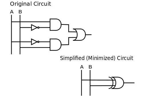 Nós podemos simplificar (minimizar) o circuito, aplicando identificadores lógicos ou utilizando a intuição. Uma vez que o exemplo mostra que A é verdadeiro quando B é falso, ou o contrário, podemos concluir que isto simplesmente significa . Em termos de portas lógicas, a desigualdade simplesmente significa uma porta XOR (OU exclusivo). Portanto, . Então os dois circuitos mostrados abaixo são equivalentes: