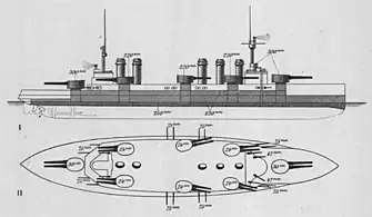 | Armamento | 4 canhões de 305 mm 12 canhões de 240 mm 16 canhões de 75 mm 8 canhões de 47 mm 2 tubos de torpedo de 450 mm |