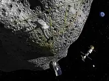 Conceito artistico de um astronauta realizando a manobra de captura de um asteóride próximo da Terra com um veículo. A Veículo para Exploração Espacial está perto, com o Orion Multi-Purpose Crew Vehicle (MPCV) ancorado no Habitat de Espaço Profundo ao fundo.